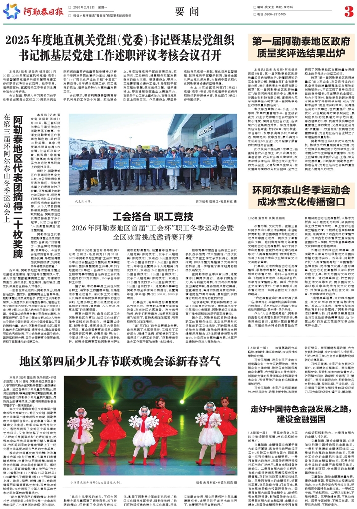 - 地区第四届少儿春节联欢晚会添新春喜气 本报讯(记者 董世菊 朱马别克·卡德尔别克)1月30日晚,阿勒泰地区第四届少儿春节联欢晚会在阿勒泰雪都大剧院精彩上演。地区各县市少年儿童齐聚舞台,用灵动的舞姿、嘹亮的歌声和真挚的表演,