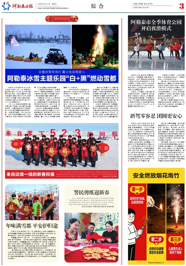 - 年味满雪都 平安护归途 本报讯(记者 杨玮璇)2月12日,阿勒泰市公安局交通管理大队组织民辅警走进辖区各年货集市,开展“年味满雪都 平安护归途”主题送福活动,以暖心服务护航群众年货采购与春运返乡路。 民辅