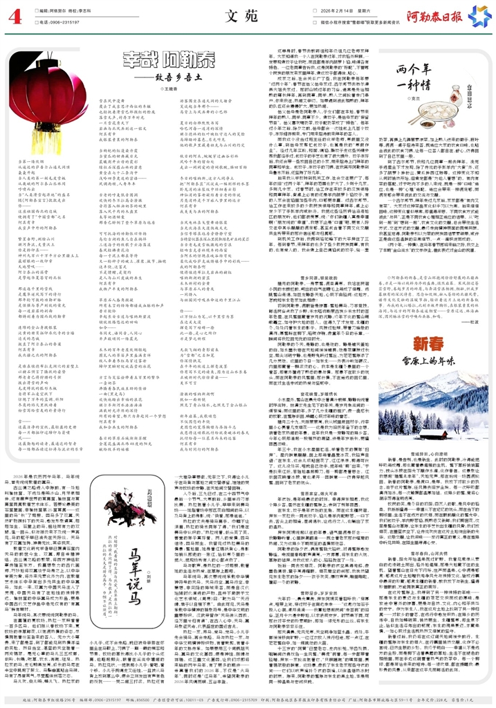 - 新春 ◎阿勒泰的新春,是雪山环抱间徐徐舒展的北疆画卷,亦是一场以纯粹为序的盛典,悄然启幕。寒风掠过苍茫雪野,卷起岁月的碎屑,与奔涌雪浪相拥、相融,织成岁暮独有的深沉诗意。思念如炊烟,融入苍劲的北疆风骨