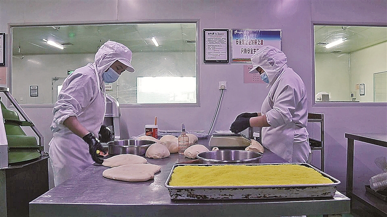 ▲上图为新疆丰吉尔食品有限公司面包生产车间内,工人们分工协作、制作精美糕点。