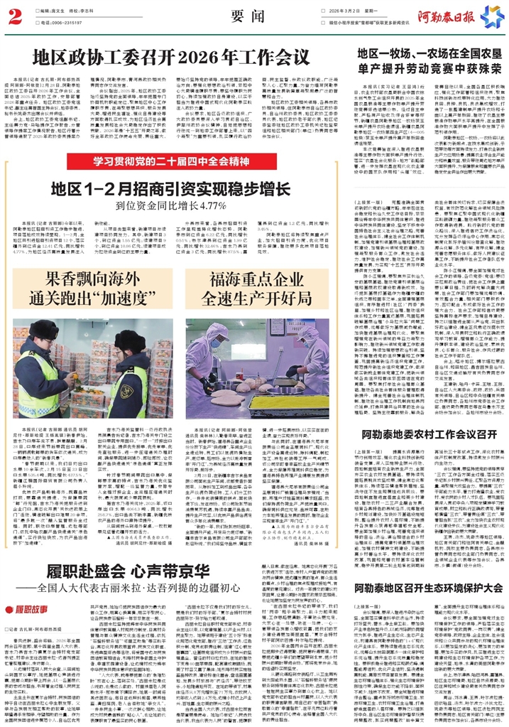 - 地区政协工委召开2026年工作会议 本报讯(记者 古扎丽·阿布都热西提 阿丽娜·阿依登)2月28日,阿勒泰地区政协工委召开2026年工作会议,全面总结2025年政协工作,安排部署2026年重点任务。地区政协工委党组书记、