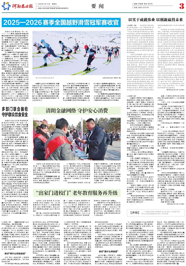 - 多部门联合抽检 守护群众饮食安全 本报讯(记者 古扎丽·阿布都热西提 通讯员 石林花)3月2日至11日,自治区组织开展第一季度农产品质量安全监督抽查工作,聚焦群众日常消费重点品类,精准发力、严格抽检。阿勒泰地县市