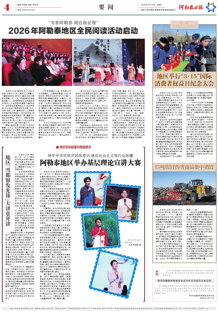 - 地区举行“3·15”国际 消费者权益日纪念大会 本报讯(记者 古扎丽·阿布都热西提 阿丽娜·阿依登)3月13日,阿勒泰地区2026年“3·15”国际消费者权益日纪念大会在阿勒泰市金山广场举行。本次活动由地区市场监督管理局、消费