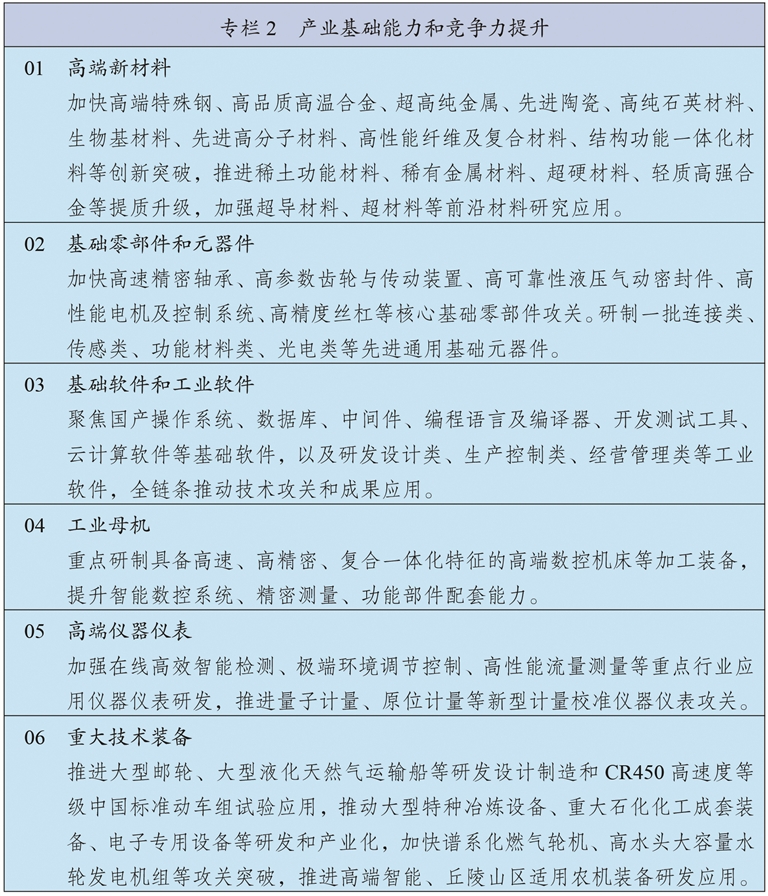 实施产业基础再造工程,加快突破一批重大基础技术、工艺和产品,推进先进材料、跨尺度制造等创新应用。实施重大技术装备攻关工程,突破一批标志性重大技术装备。滚动实施制造业重点产业链高质量发展行动,建立健全产业链供应链安全风险评估和应对机制,持续增强稀土、稀有金属、超硬材料等竞争优势,加强重要战略性矿产高质高效综合利用。推进国家战略腹地建设和关键产业备份,建设战略性产业基地、物资储备基地和基础设施。建立产业基础竞争力调查制度,强化共性技术研发支撑能力。完善首台(套)、首批次、首版次应用政策。