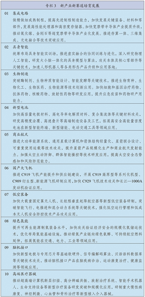 瞄准引领未来发展重点领域,构建未来产业全链条培育体系,推动量子科技、生物制造、氢能和核聚变能、脑机接口、具身智能、第六代移动通信等成为新的经济增长点。加强未来产业识别和动态调整,强化基础性、前沿性、颠覆性技术布局。建立未来产业投入增长和风险分担机制,组织实施未来产业发展示范工程,探索多元技术路线、典型应用场景、可行商业模式、市场监管规则。布局一批国家未来产业研究院和概念验证中心,依托科教资源优势突出、产业基础雄厚地区建设一批未来产业先导区。