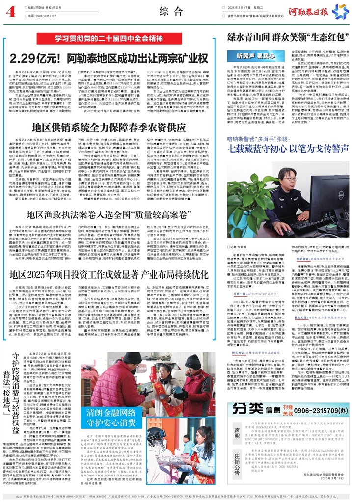 - 七载藏蓝守初心 以笔为戈传警声 □记者 古丽娜 新春的阿尔泰山雪线蜿蜒,喀纳斯湖畔银装素裹,春风裹着雪粒掠过警营的屋檐。清晨微光中,阿勒泰