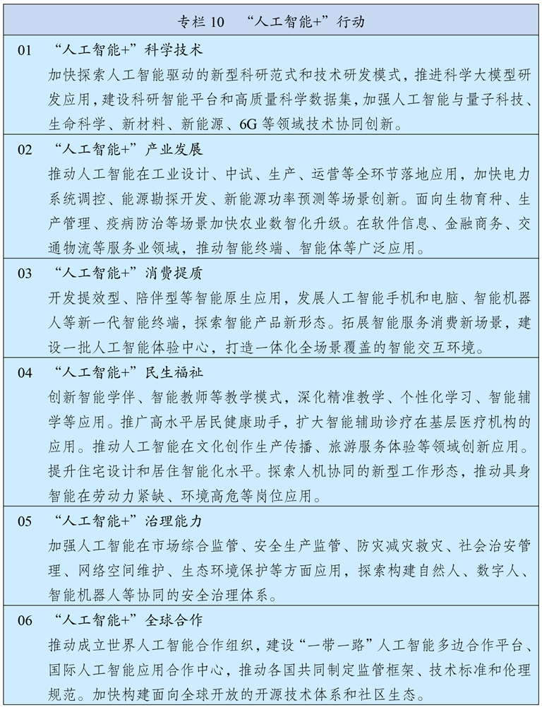 全面实施“人工智能+”行动,加强人工智能同科技创新、产业发展、文化建设、民生保障、社会治理相结合,抢占人工智能产业应用制高点,全方位赋能千行百业。