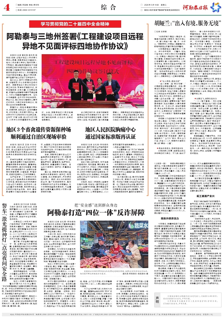 - 阿勒泰打造“四位一体”反诈屏障 本报讯(记者 古扎丽·阿布都热西提 通讯员 杜霖枫)不管是身在景区滑雪度假,还是日常居家接听电话,一份安稳可靠的安全守护,始终伴随在阿勒泰各族群众身边。 今
