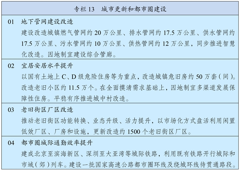 推动城市发展方式转变,建设创新、宜居、美丽、韧性、文明、智慧的现代化人民城市。实施激发产业创新活力专项行动,提升城市产业创新策源力。高质量推进城市更新,开展城市体检,加快建设完整社区,健全城市更新实施机制,建立与建筑功能转换和混合利用需求相适应的规划调整机制,构建可持续的城市建设运营投融资体系。高效利用城市地下空间。推动城市发展绿色低碳转型,优化城市公共交通服务,健全城市公园、绿道网络和慢行交通系统,不断完善15分钟健身圈。加快城市基础设施生命线安全工程建设,推进老旧管网和危旧房改造,提升城市排水防涝能力。严格限制超高层建筑,提升高层建筑火灾防范和救援能力。加强城市风貌和建筑设计管理,推动城市建筑更好体现中华美学和时代风尚。加强互嵌式社区建设。推进城市全域数字化转型,完善城市管理机制和运行管理服务平台,推动城市治理智慧化精细化。