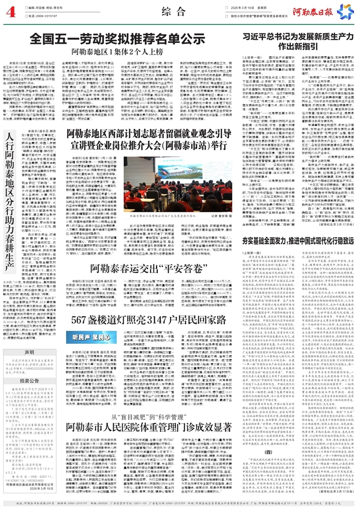 - 全国五一劳动奖拟推荐名单公示 本报讯(记者 古丽娜)近日,自治区总工会公示2026年全国五一劳动奖拟推荐对象名单,阿勒泰地区共有1个先进集体、2名先进个人入选该名单,展现出阿勒泰地区各行各业