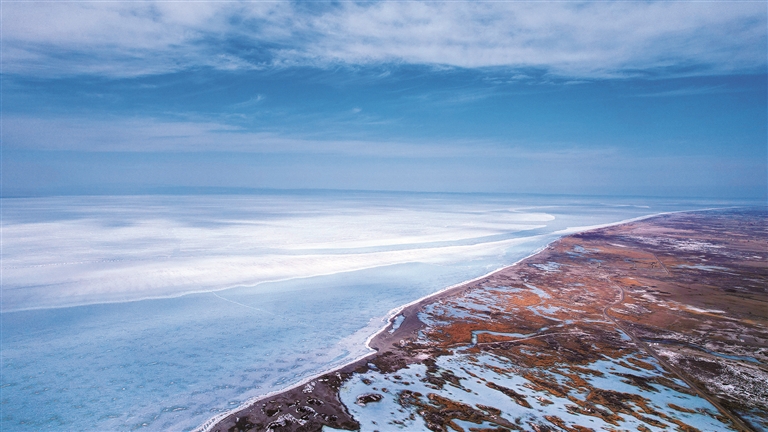 初春时节,福海县乌伦古湖国家湿地公园冰雪渐融、春水初生。碧蓝的天空与乳白的春水相映成趣,勾勒出一幅静谧和谐的春日画卷。