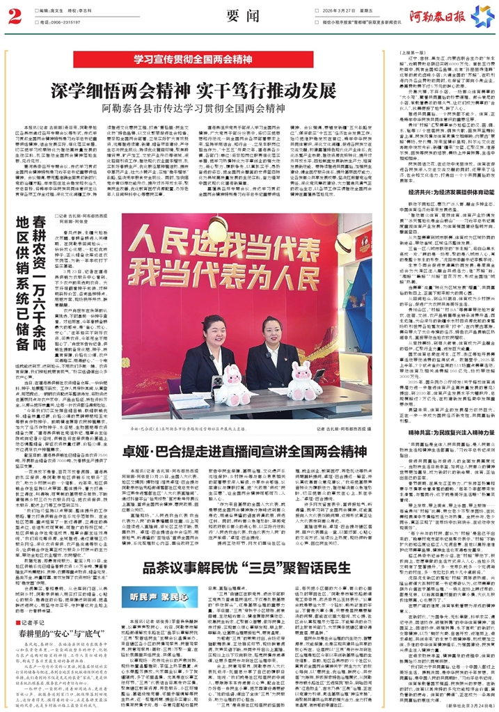 - 深学细悟两会精神 实干笃行推动发展 本报讯(记者 古丽娜)连日来,阿勒泰地区各县市通过召开专题会议等形式,传达学习贯彻全国两会精神特别是习近平总书记重要讲话精神,结合发展实际,细化落实举措,切实把