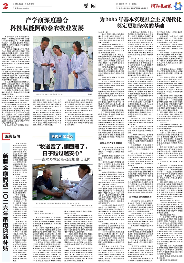 - 产学研深度融合 科技赋能阿勒泰农牧业发展 本报讯(实习记者 王景鸿 通讯员 周纪松)一侧是静谧的大学校园,孕育着“从0到1”的原始创新;一侧是热闹的农牧业生产一线,催生着新的发展动能。在阿勒泰,这两股力量正从“隔墙相望”